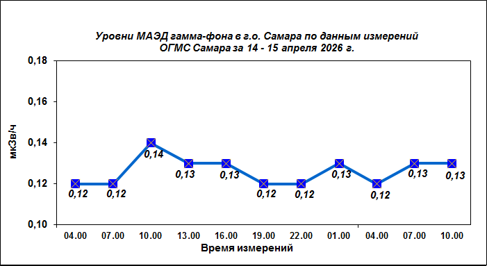 Результаты наблюдений за уровнем гамма-фона на метеостанции (ОГМС) Самара за последние сутки приведены на диаграмме: